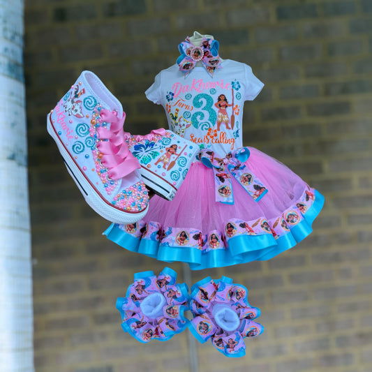 Moana Tutu Outfit, Moana Birthday tutu outfit, 2 Layer Ribbon Trimmed Moana tutu set with matching sneakers and socks.