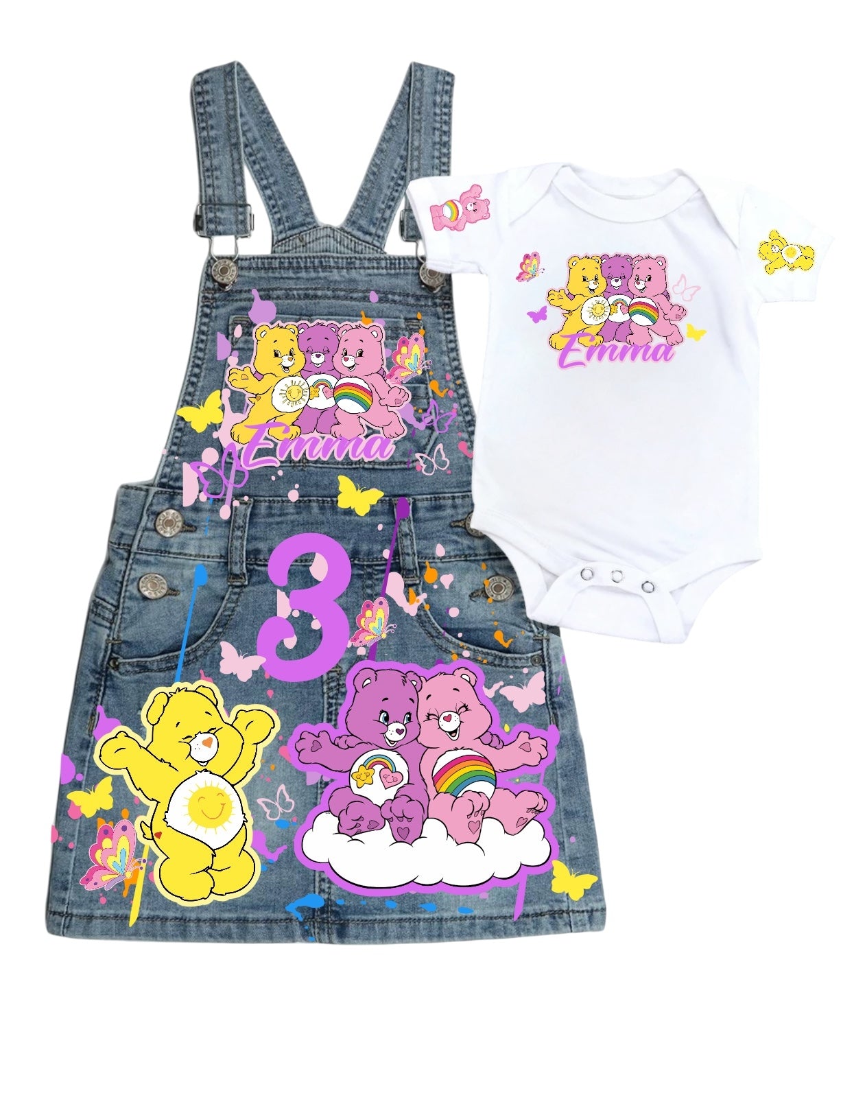 Carebear Denim outfit, Carebear jeans overall dress, Carbear Birthday jeans outfit