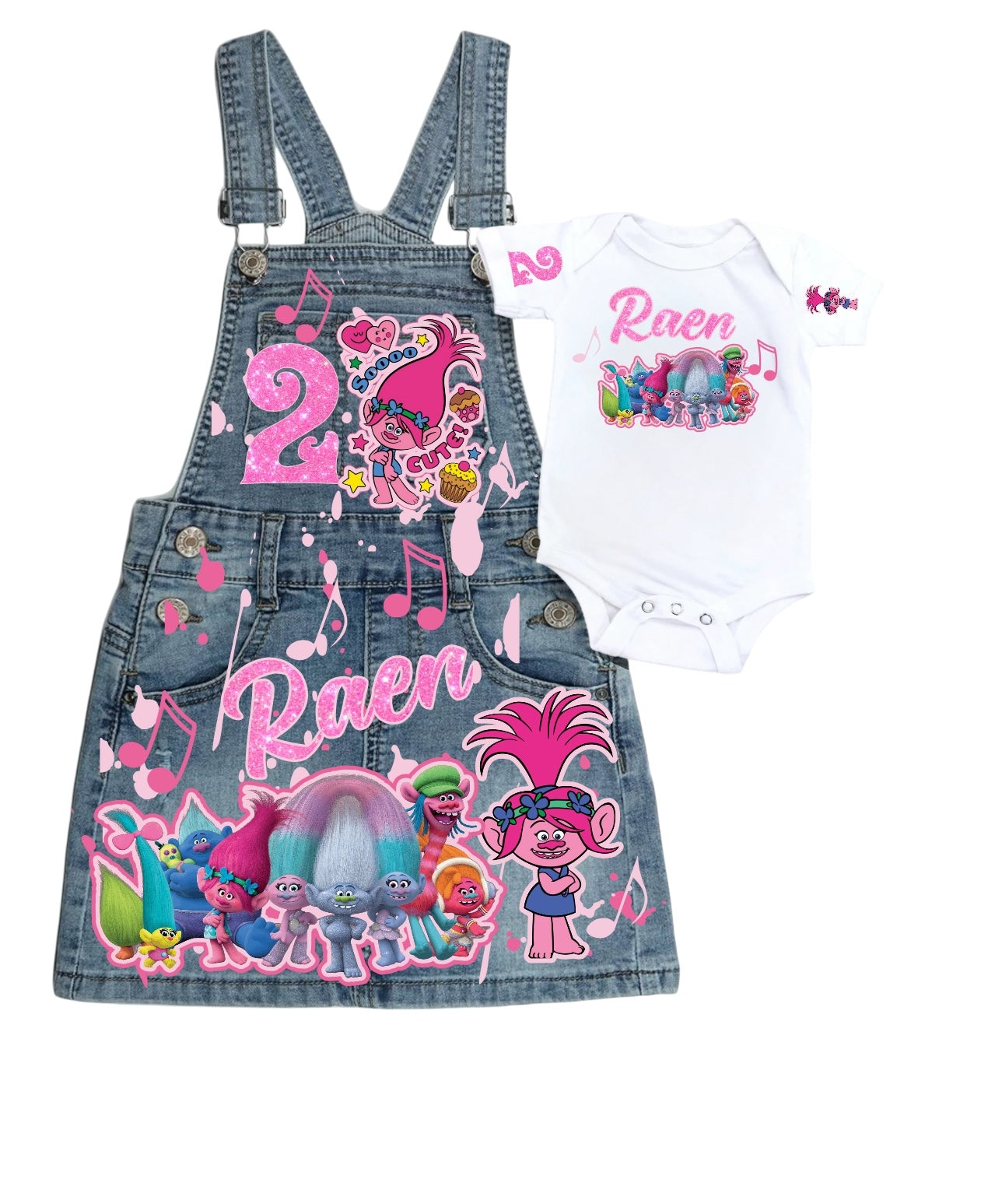 Troll Denim overall dress, Troll Jeans Birthday Dress, Poppy birthday jeans outfit