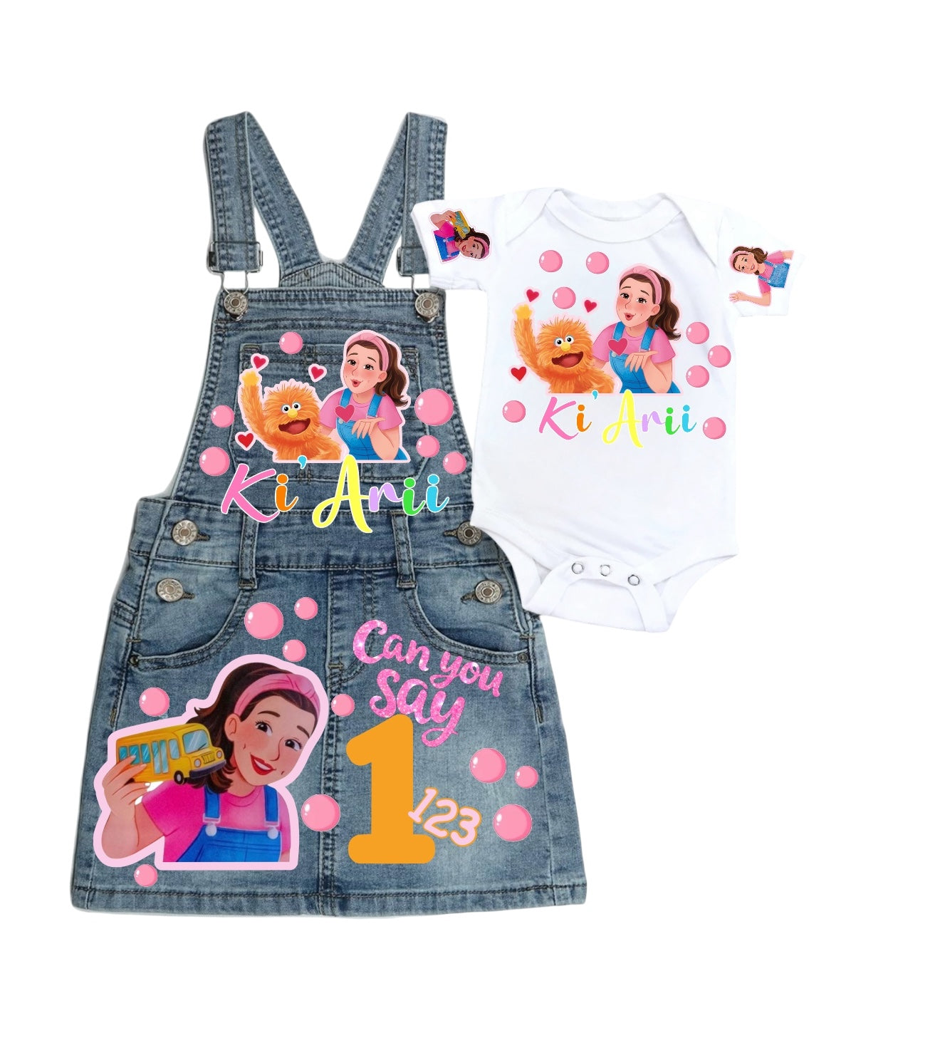 Ms Rachel Denim overall outfit, jeans overall dress, Ms Rachel birthday jeans dress